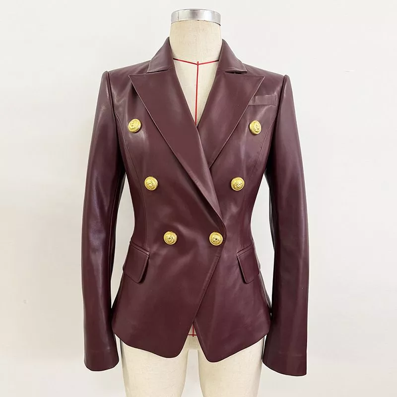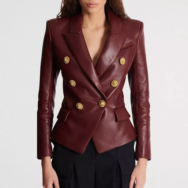 Giacca donna dal carattere deciso e contemporaneo, realizzata in pelle sintetica dall’aspetto liscio e compatto. Il design doppiopetto con bottoni decorativi dorati valorizza la figura creando una linea slanciata e femminile. La struttura definita sulle spalle e il taglio aderente rendono questo capo ideale per outfit eleganti e curati, perfetti sia per occasioni speciali che per look serali ricercati.