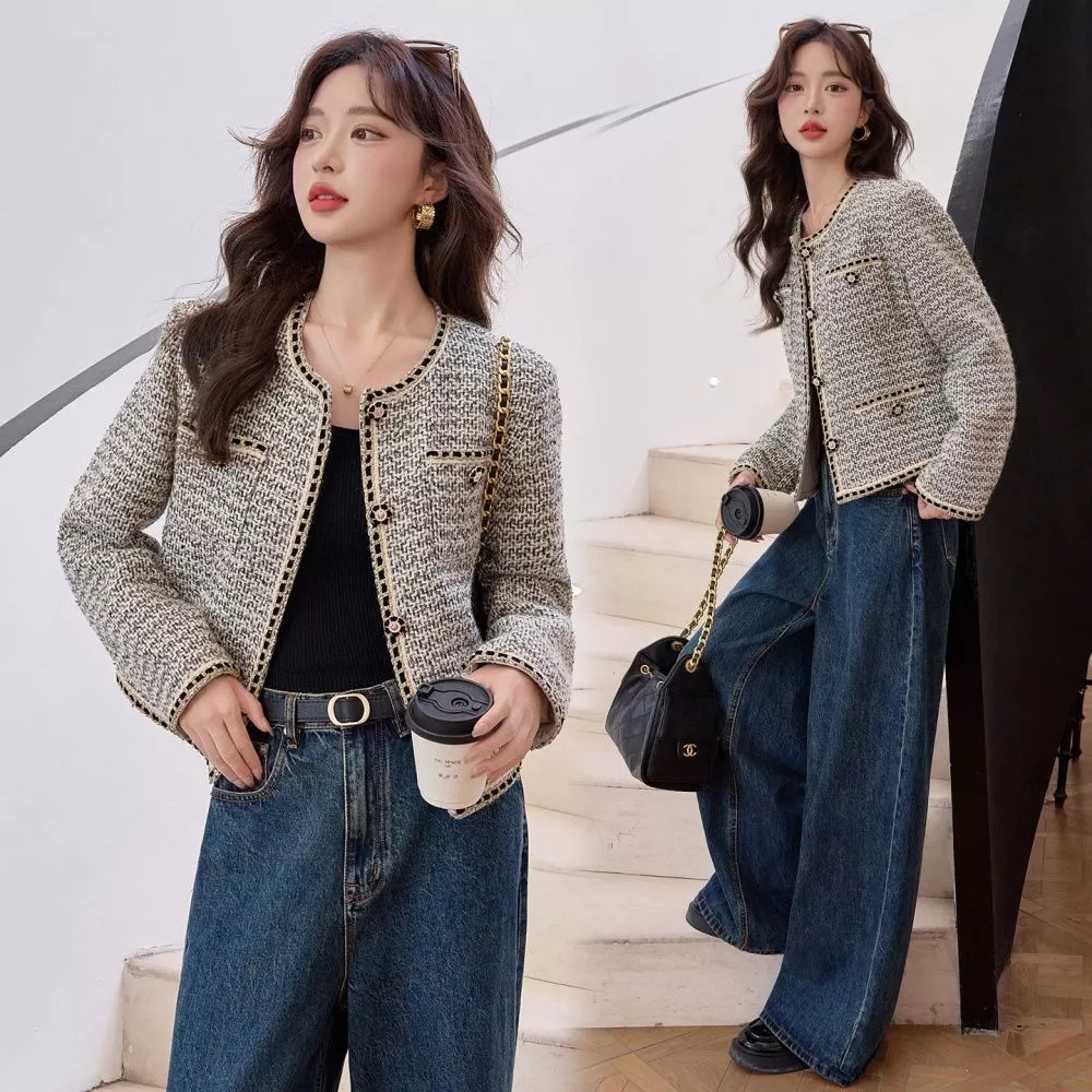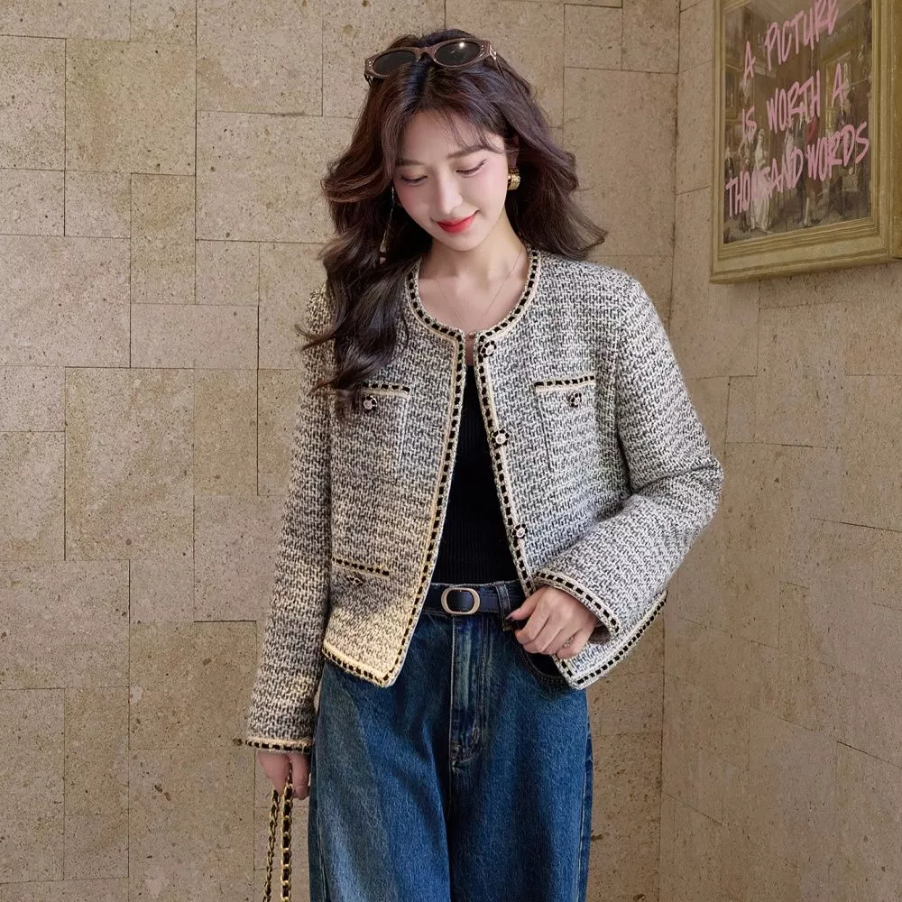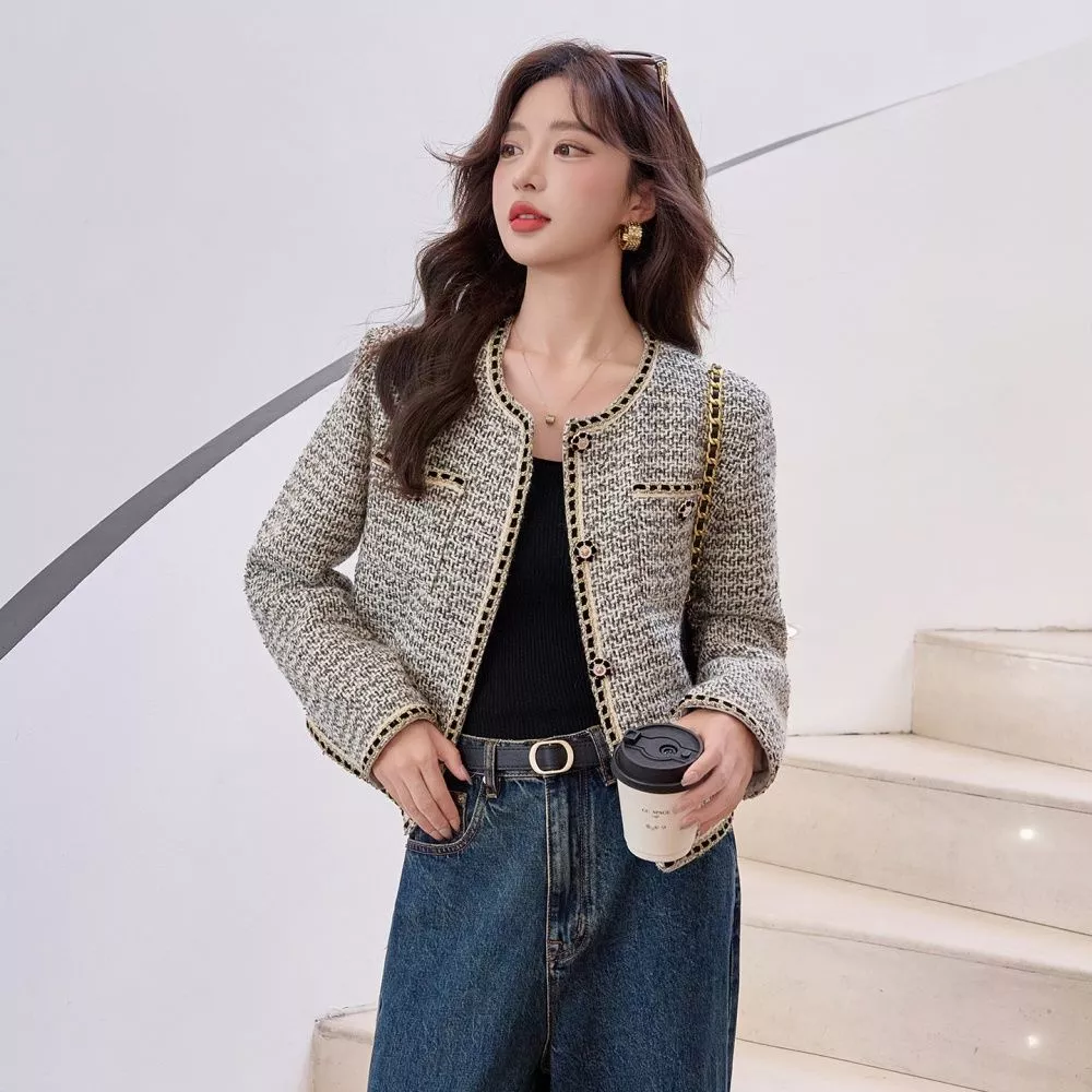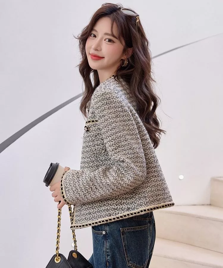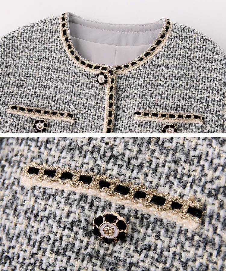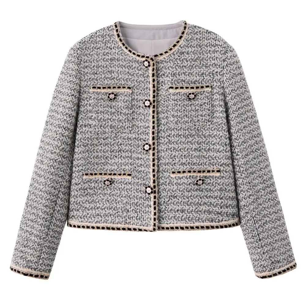 Giacca donna corta in tweed grigio dall’eleganza raffinata, perfetta per valorizzare look quotidiani e outfit più curati. La struttura definita e i profili a contrasto donano un aspetto ordinato e femminile, mentre i bottoni gioiello aggiungono un dettaglio luminoso e ricercato. Ideale da abbinare a jeans a vita alta, pantaloni sartoriali o gonne per uno stile versatile e sempre attuale.