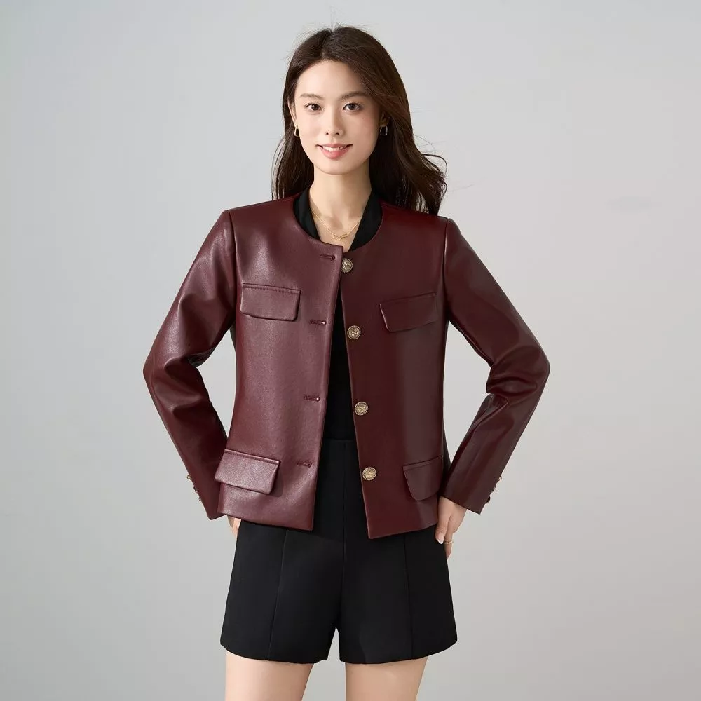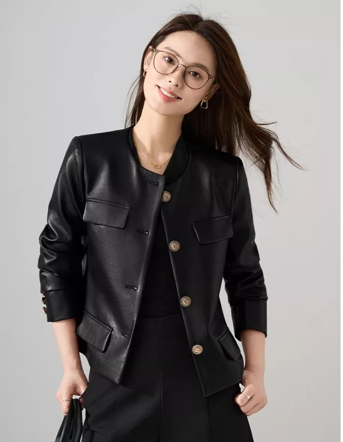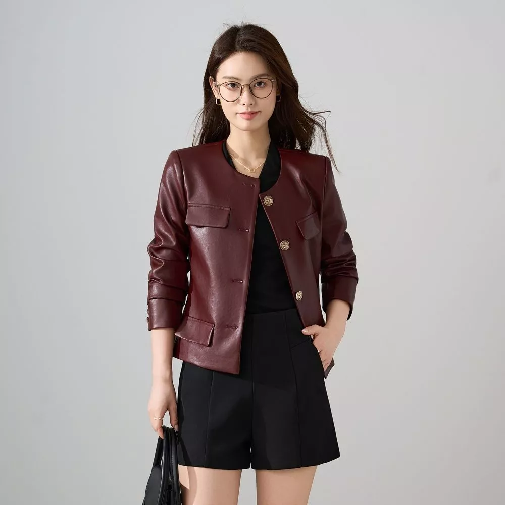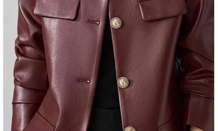 Giacca elegante da donna in similpelle, con linea slim fit e taglio corto moderno. Impreziosita da bottoni dorati decorativi e tasche applicate, unisce stile contemporaneo e fascino intramontabile. Perfetta per look casual chic, outfit da sera o per aggiungere un tocco di carattere a un look quotidiano. Disponibile in nero e vino rosso.