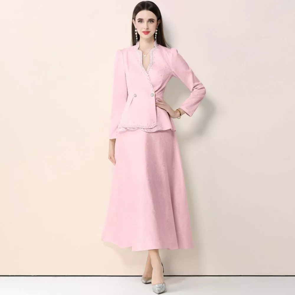 Set Elegante Donna Rosa Con Giacca Sagomata E Gonna Lunga Jacquard CF64922