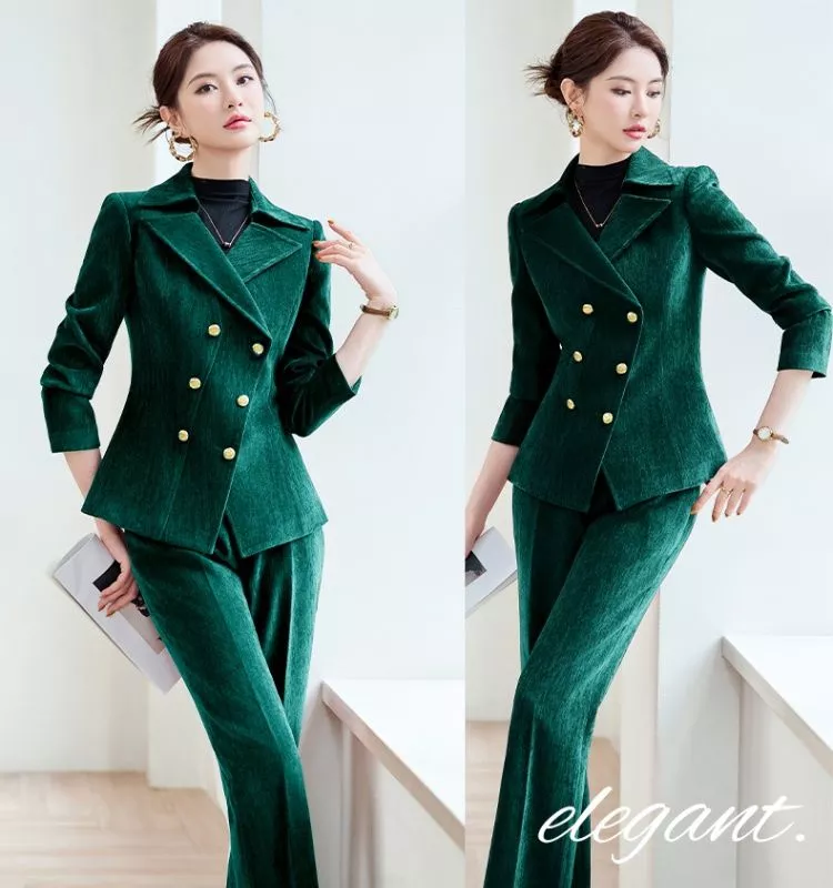 Completo Donna Elegante Verde In Velluto Giacca Doppiopetto E Pantalone CF61345
