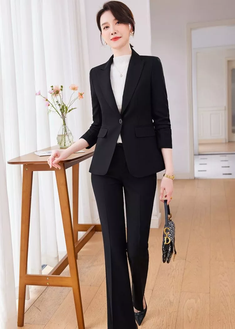 Completo Donna Nero Elegante Giacca Sagomata E Pantalone Slim Da Ufficio CF61818