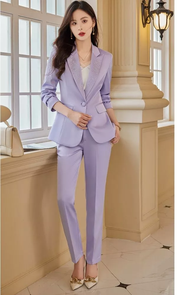Completo Donna Viola Elegante Giacca Sagomata E Pantalone Slim Raffinato CF61818