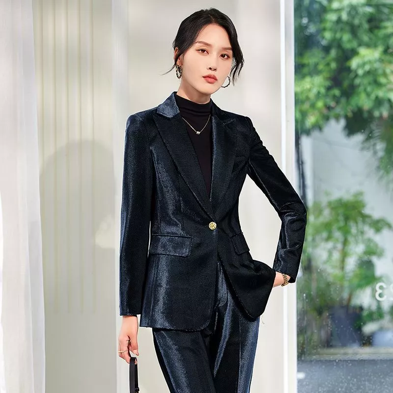Completo Donna Blu Navy In Velluto Elegante Giacca E Pantalone Slim CF61822