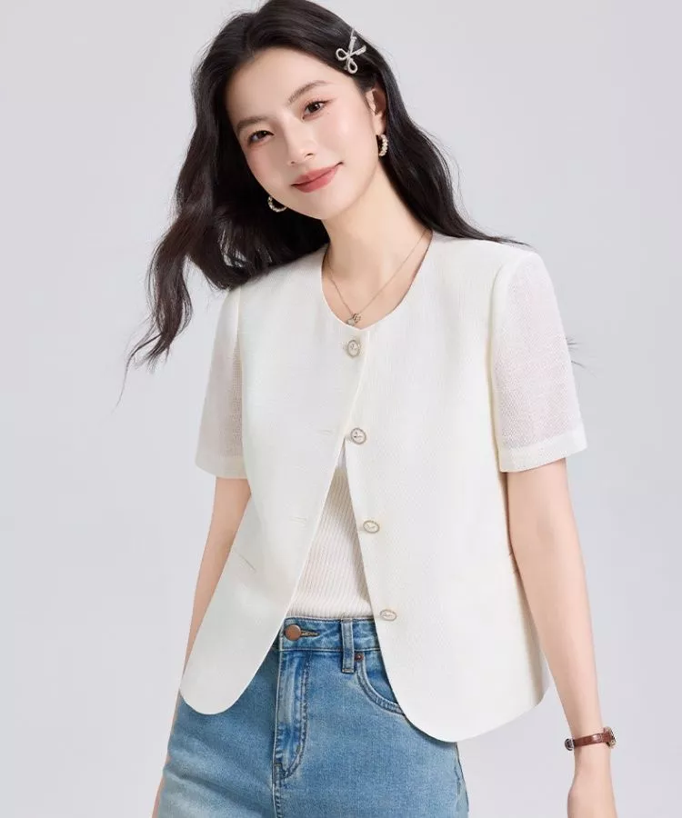 Il taglio corto valorizza la silhouette mentre le maniche corte rendono il capo leggero e confortevole. I bottoni frontali aggiungono un dettaglio elegante che rende questa giacca perfetta da abbinare a jeans, pantaloni sartoriali o gonne.