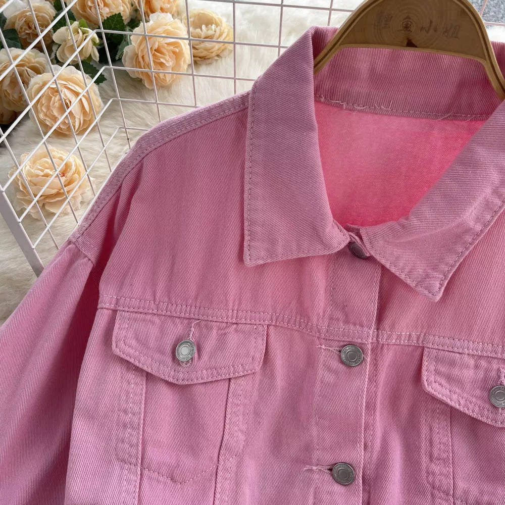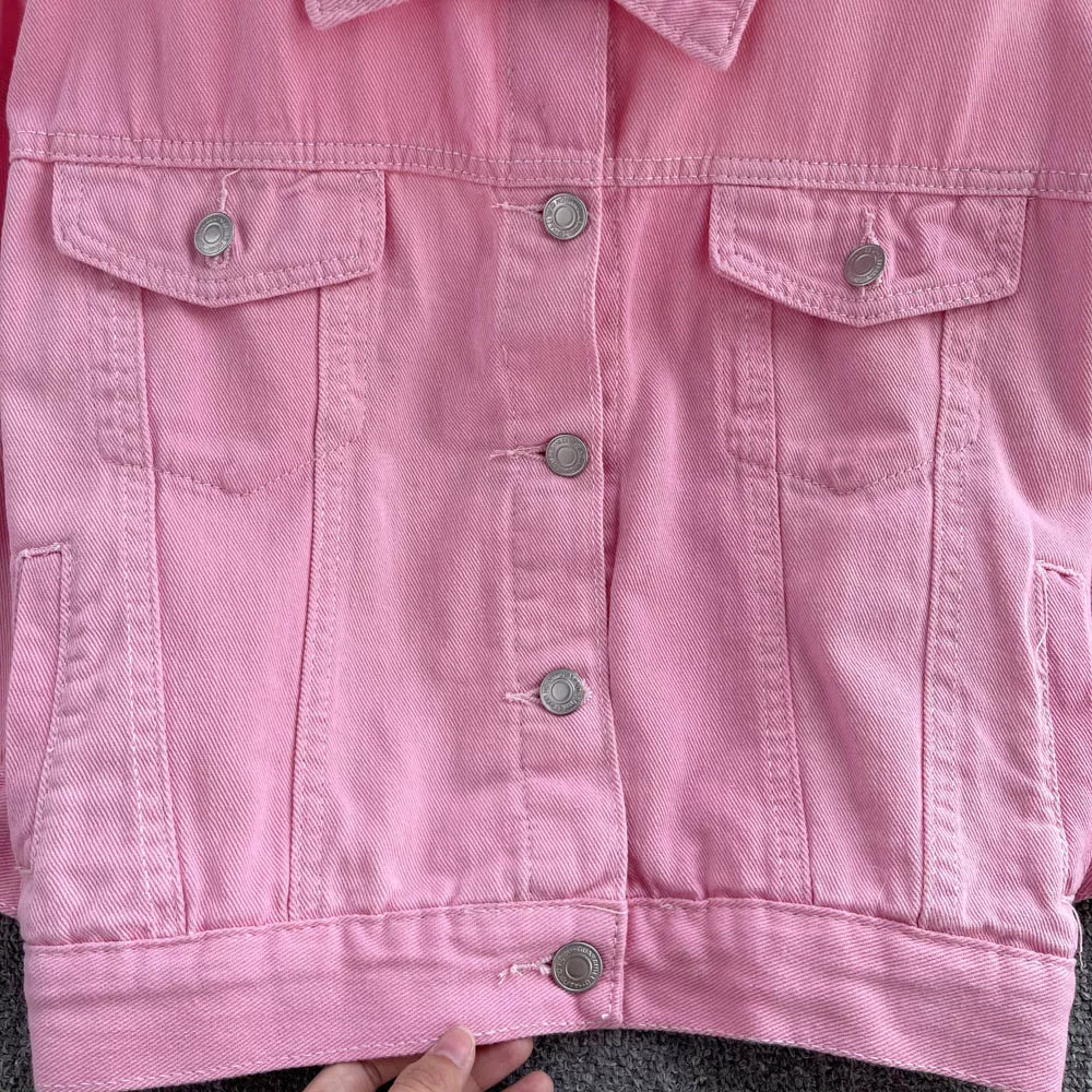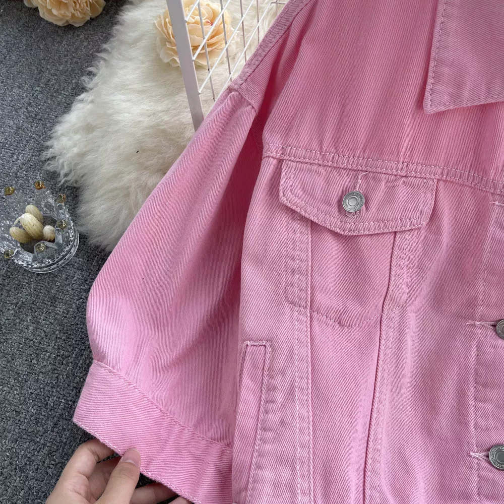 Giacca giubbino donna rosa corto denim jeans bottoni slim 31720