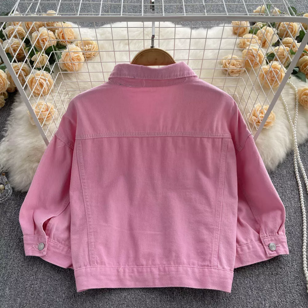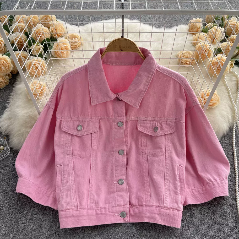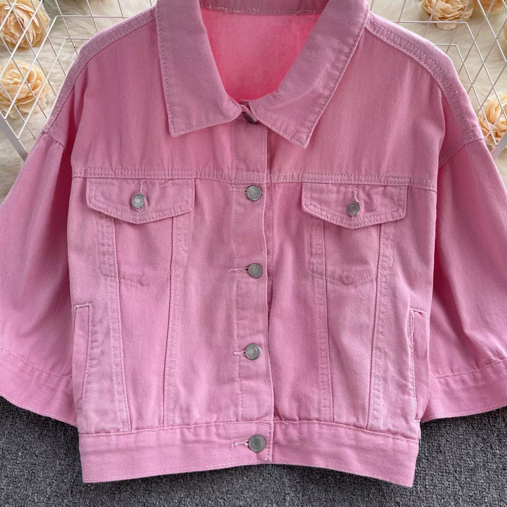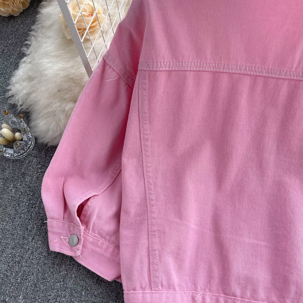 Giacca giubbino donna rosa corto denim jeans bottoni slim 31720