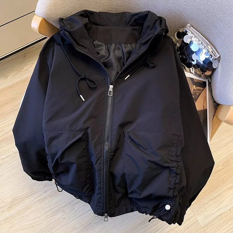 Giacca Nera Tecnica Impermeabile Con Cappuccio Stile Casual Comoda Donna CF58375