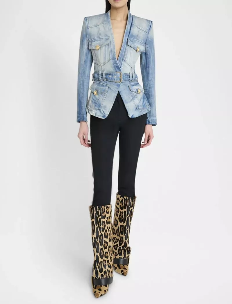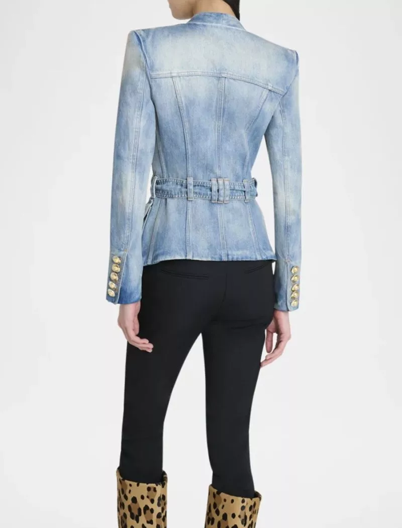 Giacca slim da donna in denim blu con cintura regolabile, un capo sofisticato che unisce stile casual e dettagli eleganti. Il taglio avvitato esalta la silhouette, mentre le tasche con bottoni oro aggiungono un tocco chic e moderno. Versatile e glamour, è ideale per look da giorno curati, outfit serali o occasioni speciali in cui distinguersi con personalità.