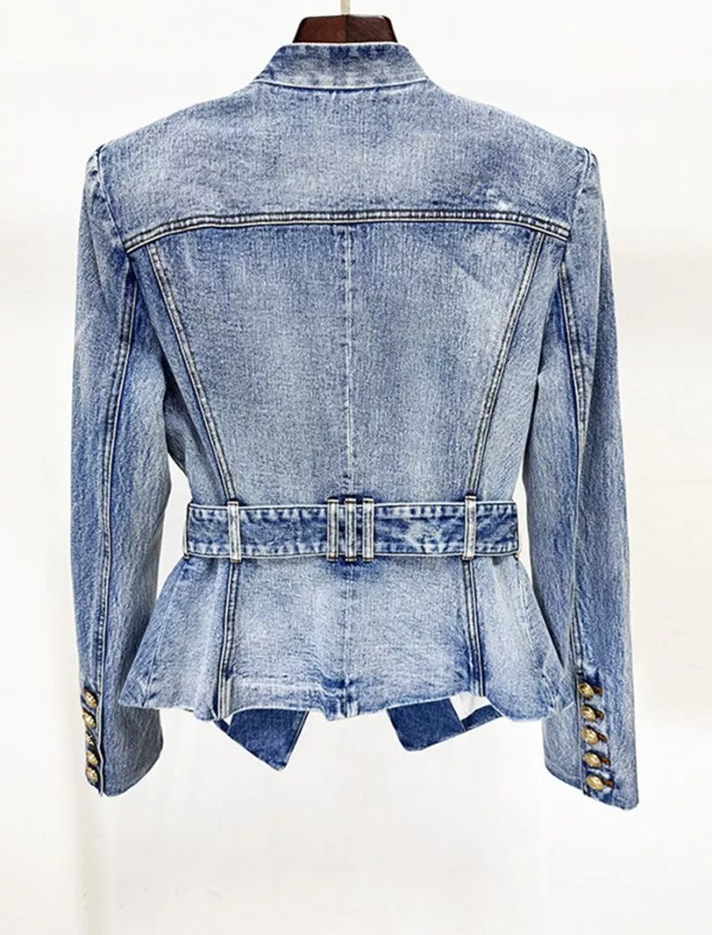 Giacca Slim Donna Denim Blu Con Cintura Elegante Tasche Oro Moda CF54340