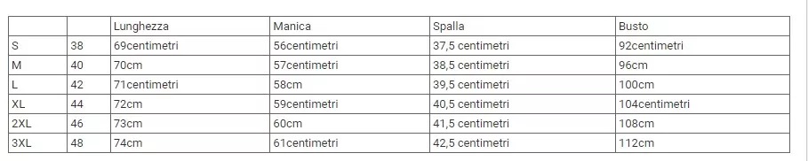 | 3XL | 48 | 74cm | 61centimetri | 42,5 centimetri | 112cm |
