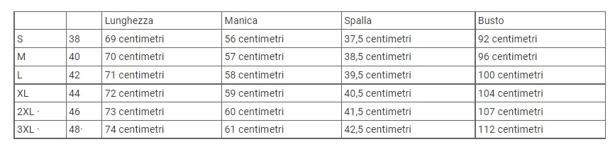 | 3XL · | 48· | 74 centimetri | 61 centimetri | 42,5 centimetri | 112 centimetri |