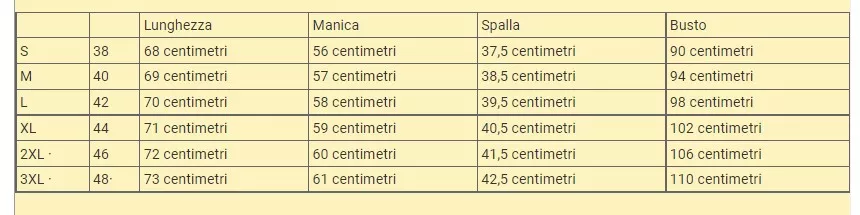 | Lunghezza | Manica | Spalla | Busto | ||