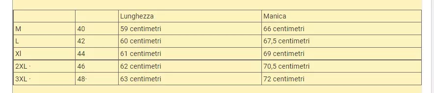 a seguire la tabella taglie