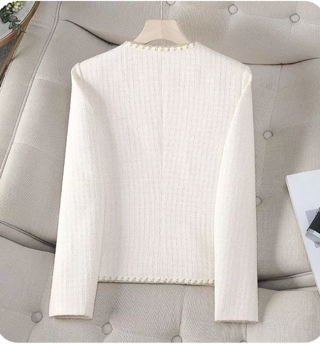 Giacca corta in tweed dal taglio elegante, arricchita da raffinati bottoni gioiello frontali.