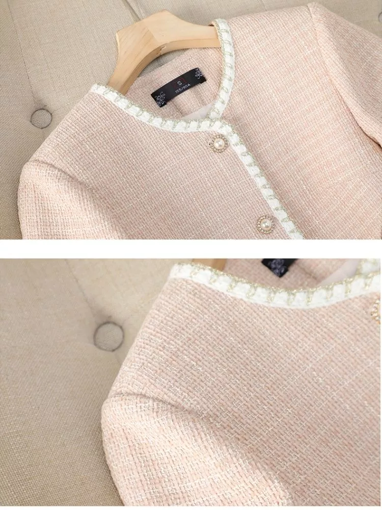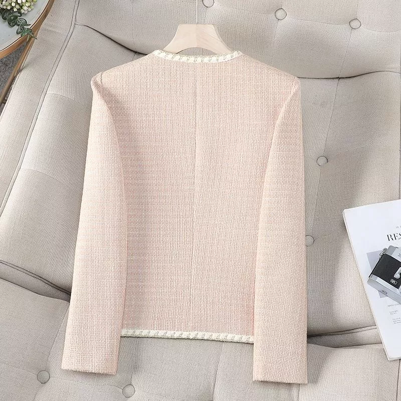 Giacca corta in tweed dal taglio elegante, arricchita da raffinati bottoni gioiello frontali.