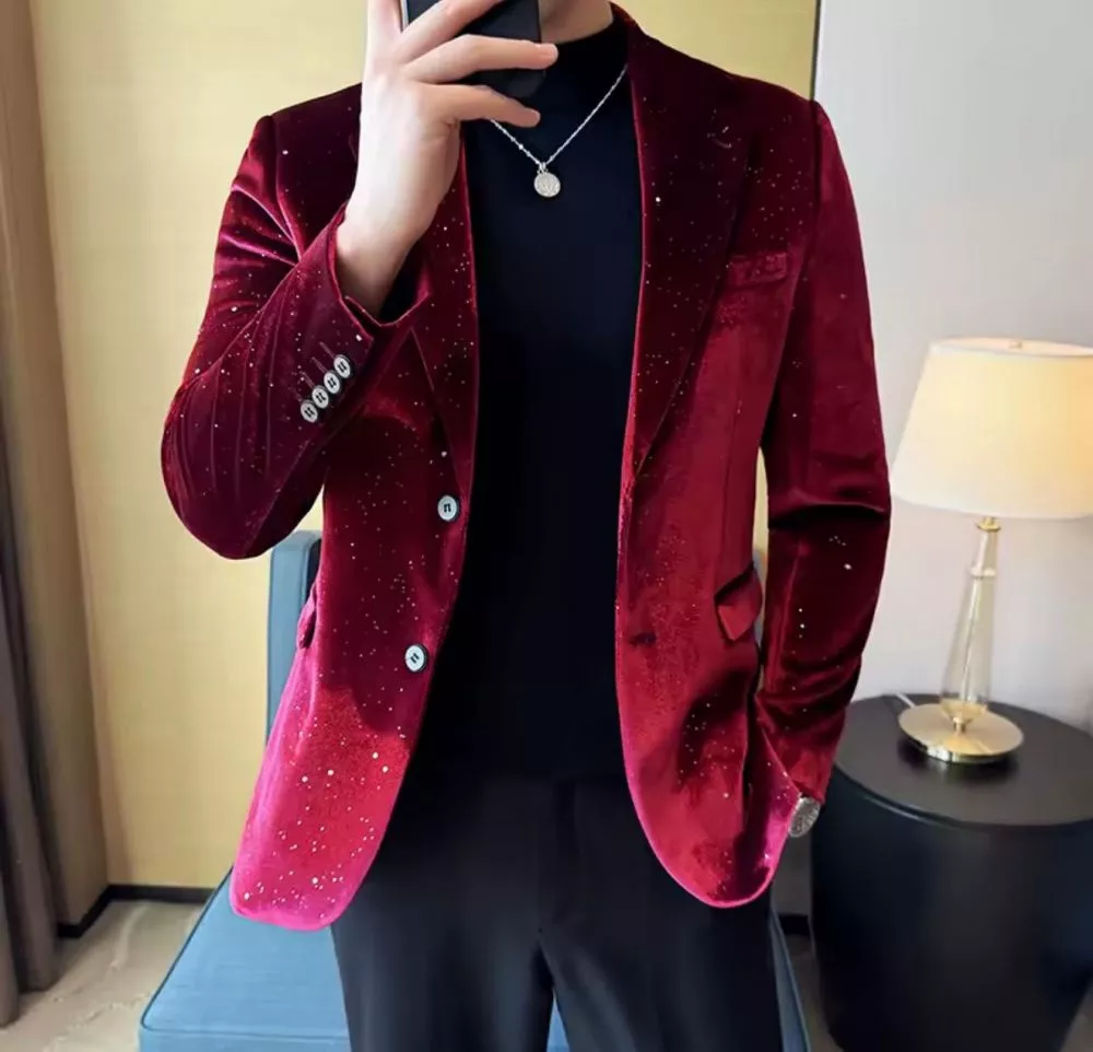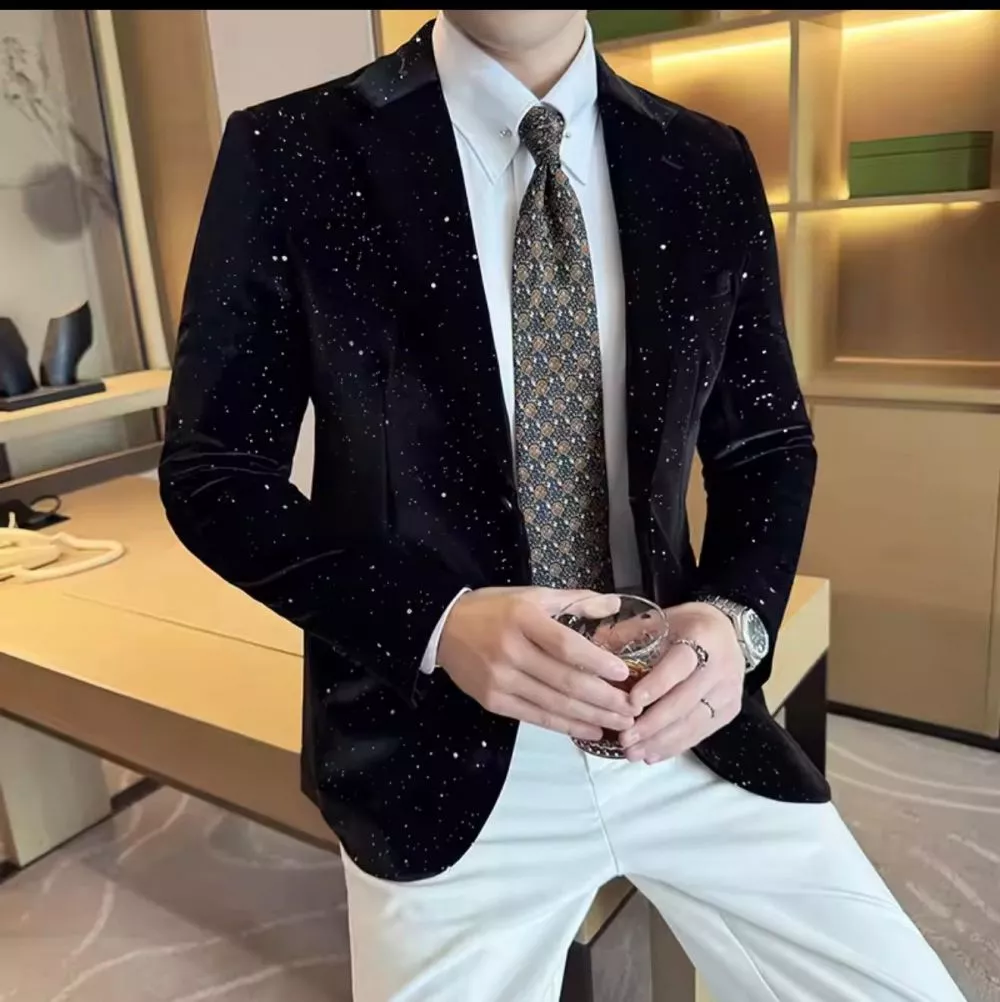 Questa giacca in velluto sintetico con effetto luminoso è progettata per chi cerca uno stile elegante ma contemporaneo. La superficie in velluto esalta i colori profondi, mentre i micro-puntini brillanti aggiungono un tocco distintivo perfetto per serate, eventi e look che richiedono presenza scenica senza esagerare.