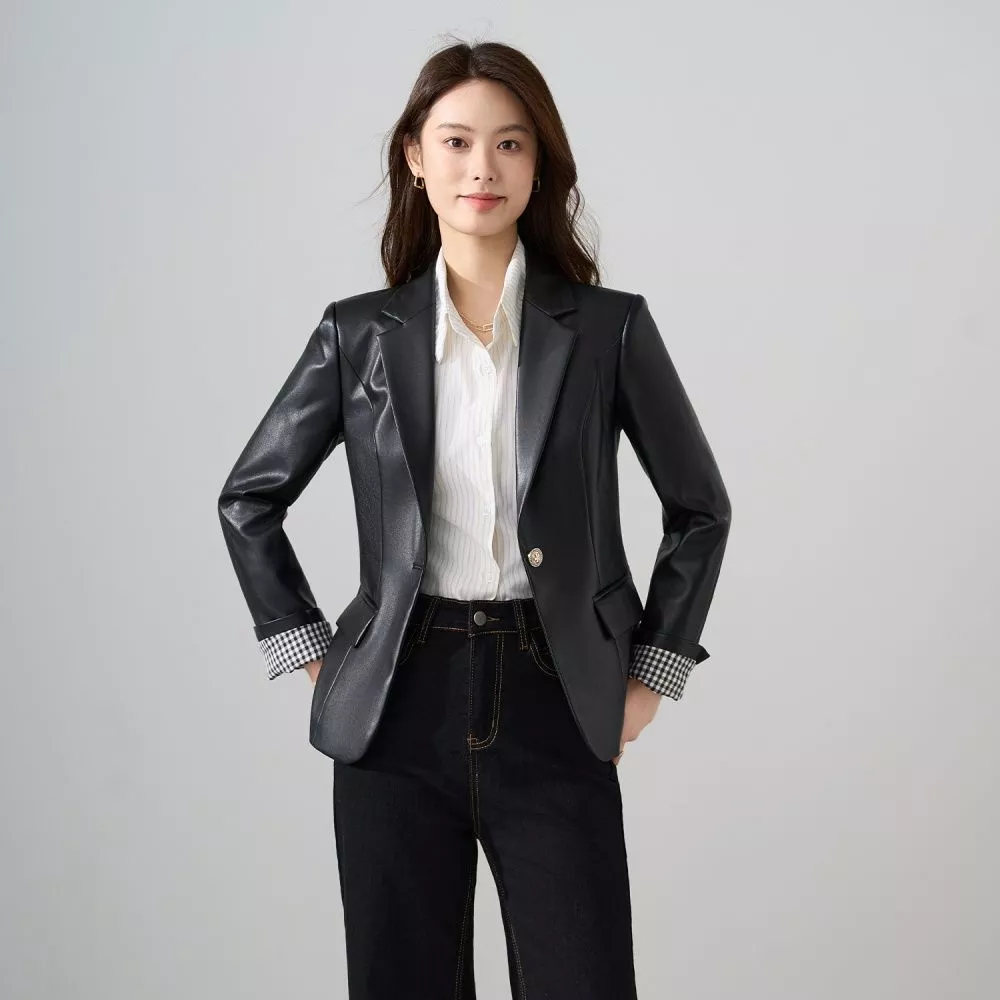 Blazer Donna Nero Elegante In Similpelle Bottone Singolo E Fodera Quadri CF52315