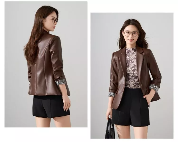 Blazer Donna Marrone Elegante In Simil Pelle Bottone E Fodera Quadri CF52315
