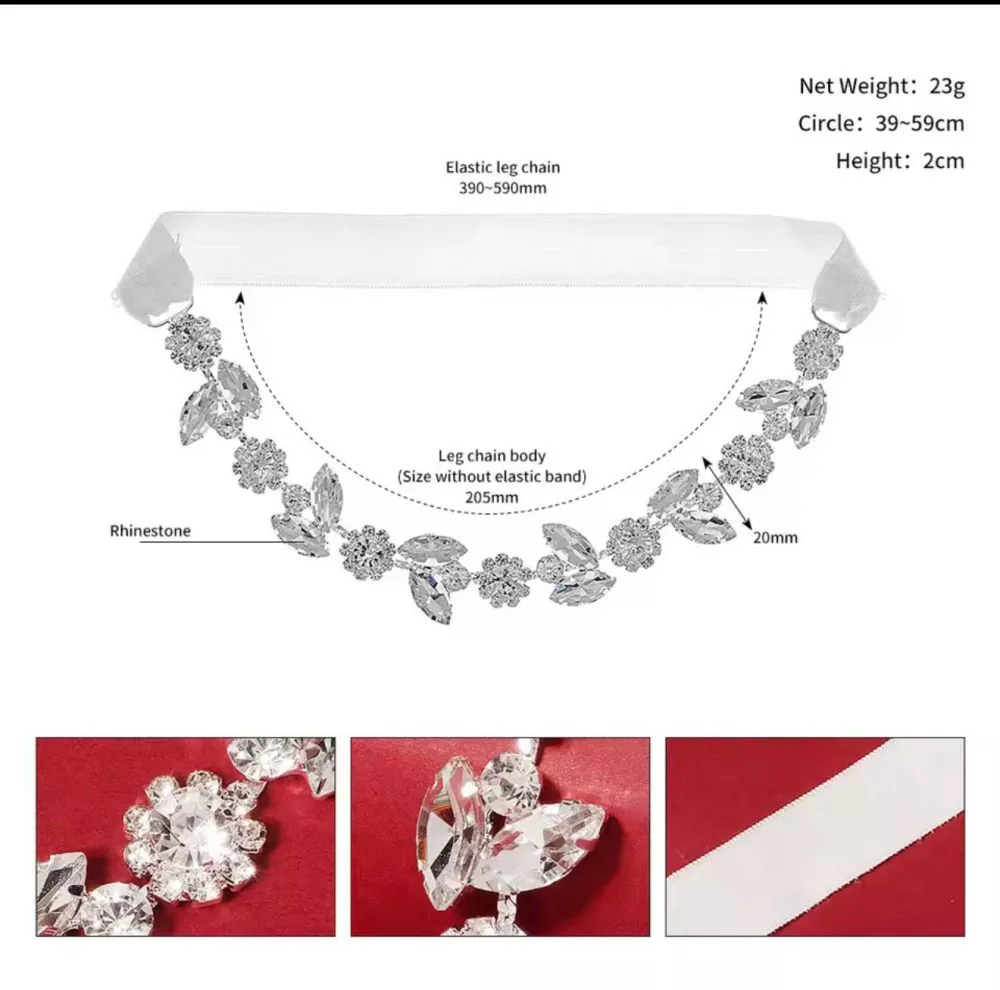 Giarrettiera gioiello elegante con cristalli luminosi e fascia elasticizzata, pensata per valorizzare la gamba con un dettaglio raffinato e scenografico. Il design brillante effetto red carpet dona luce e carattere, rendendola perfetta per spose, cerimonie ed eventi esclusivi.
