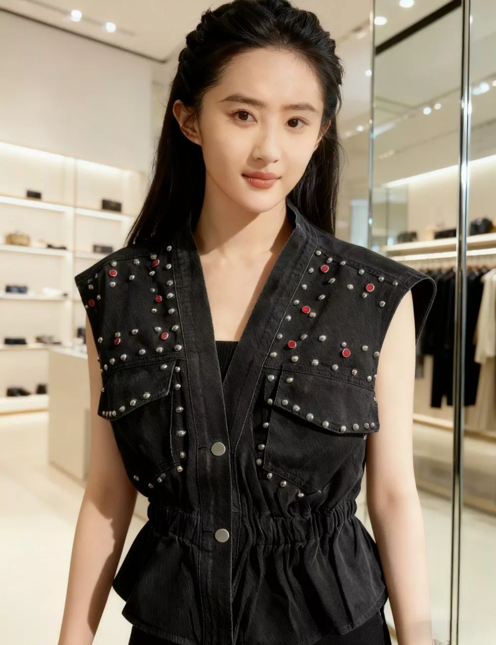 Gilet denim donna dal design moderno e deciso, caratterizzato da linea smanicata e vita regolata che valorizza la silhouette. Il tessuto denim dona struttura, mentre i dettagli decorativi applicati sul davanti aggiungono personalità al look. Perfetto da indossare sopra top, camicie o t-shirt per creare outfit urbani, casual o contemporanei, ideali per il giorno e il tempo libero.