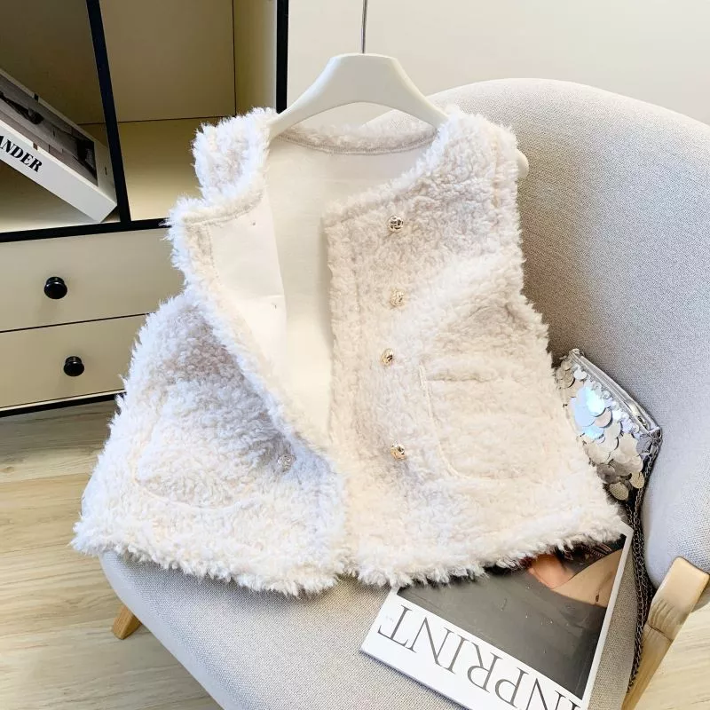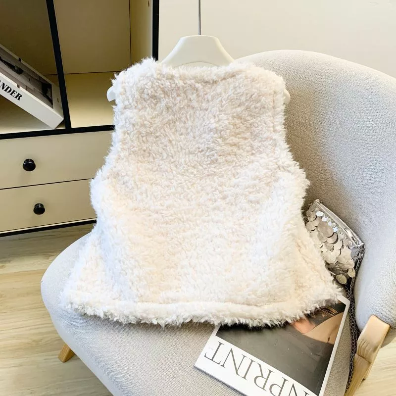 Gilet donna smanicato dal design raffinato, realizzato in tessuto morbido effetto peluche, ideale per completare outfit eleganti o casual chic.