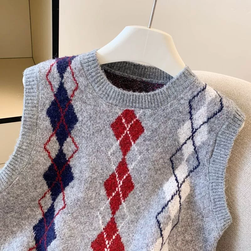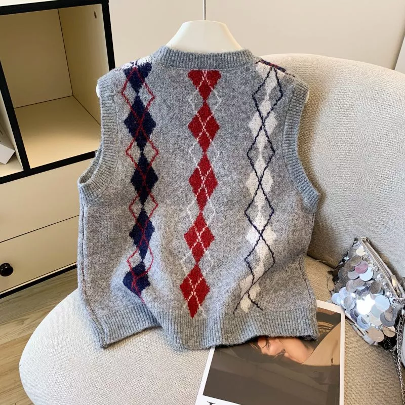 Gilet In Maglia Grigio Con Motivo Scozzese A Rombi Senza Maniche CF55675