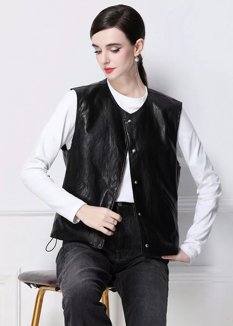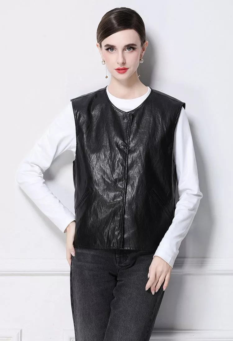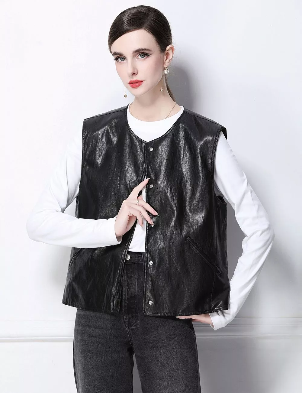 Gilet nero da donna in pelle sintetica dal taglio dritto e moderno, perfetto per completare outfit eleganti o casual. Il design minimal con bottoni frontali dona un tocco contemporaneo, mentre il tessuto effetto pelle aggiunge carattere e versatilità. Indossalo sopra camicie bianche o maglie sottili per uno stile sofisticato e metropolitano. Ideale per la mezza stagione, questo capo si distingue per il suo equilibrio tra praticità e fascino urbano.
