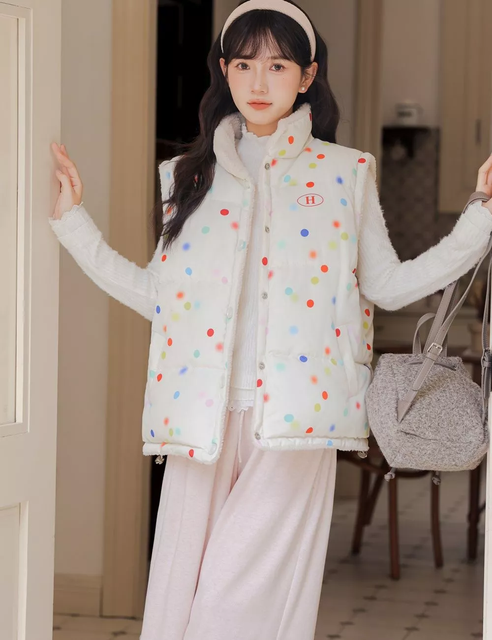 Gilet Avorio Imbottito Morbido Pois Multicolor Caldo Elegante Look Donna CF58794