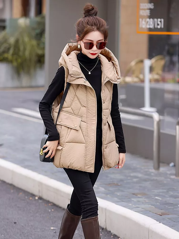 Gilet Imbottito Lungo Con Cappuccio Ampio Cachi Casual Caldo Inverno CF60696