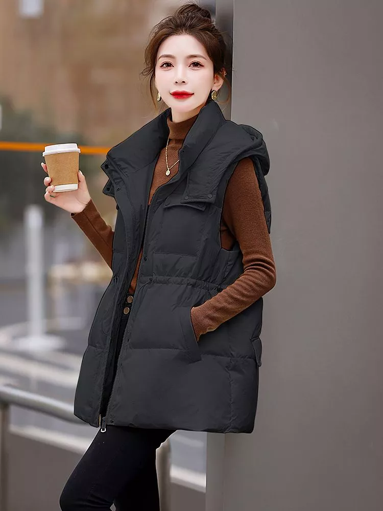 Gilet Imbottito Lungo Con Cappuccio Ampio Nero Casual Caldo Invernale CF60696