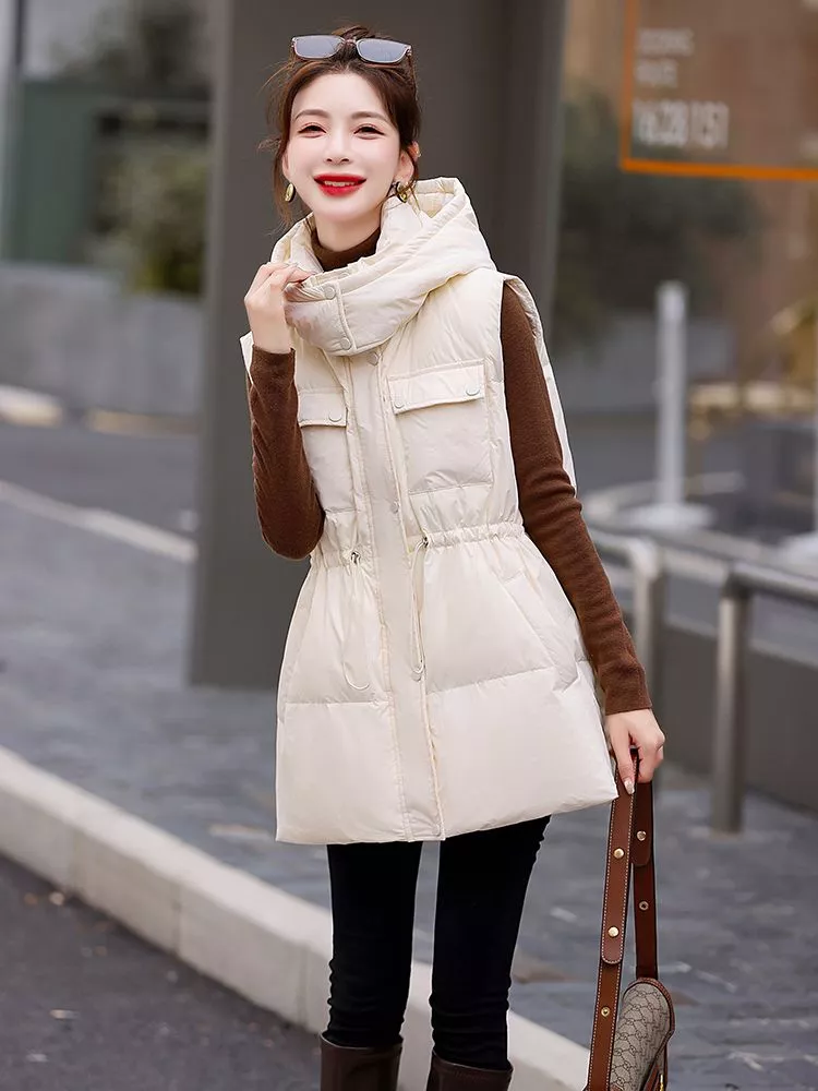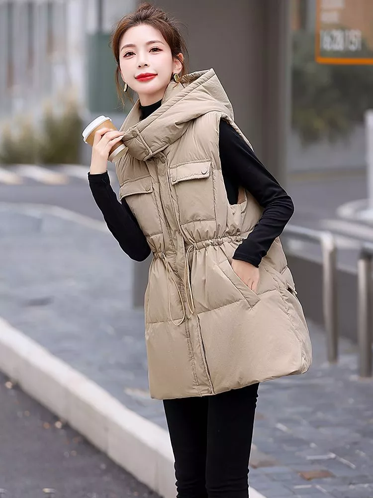 Gilet Imbottito Lungo Con Cappuccio Regolabile Beige Casual Inverno CF60697