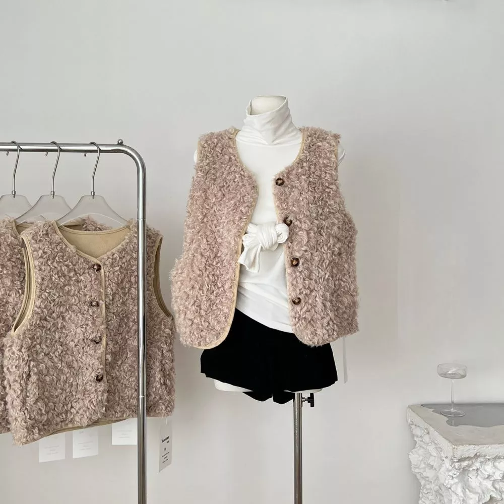 Gilet Donna Pelliccia Beige Corto Elegante Senza Maniche Look Raffinato CF61546