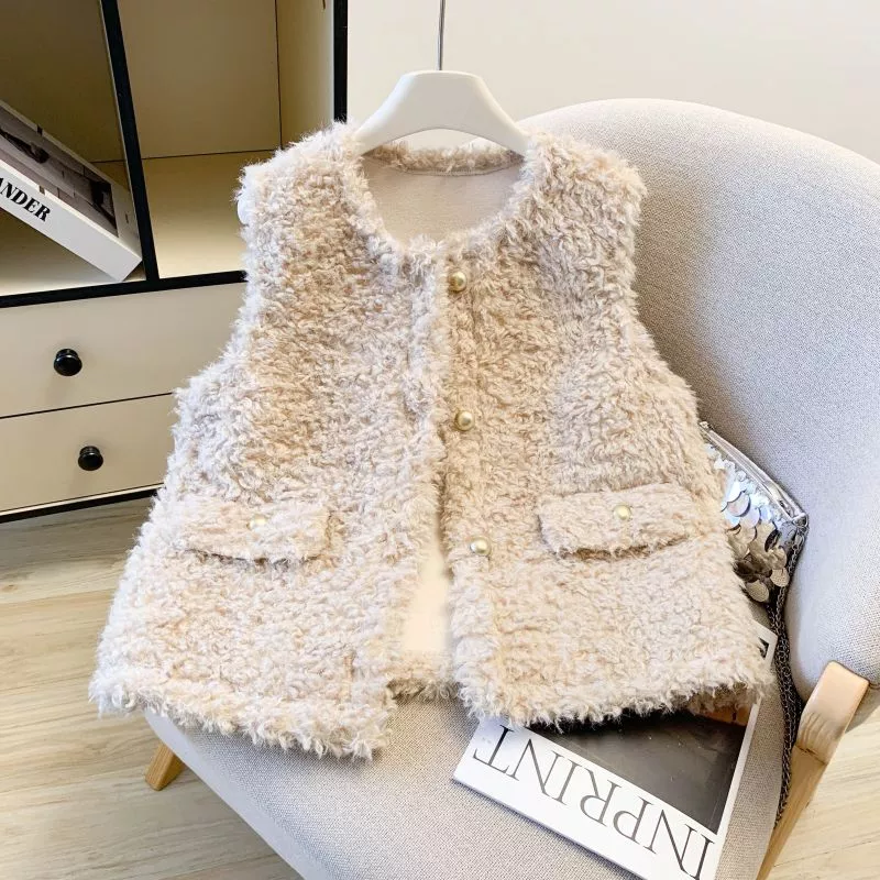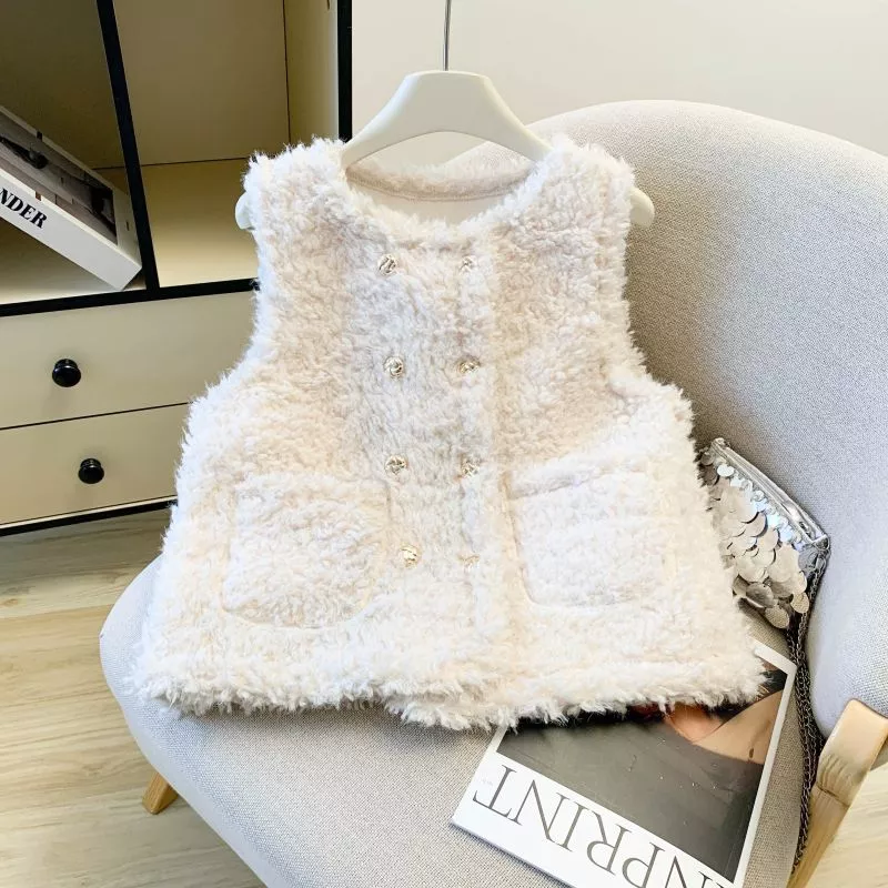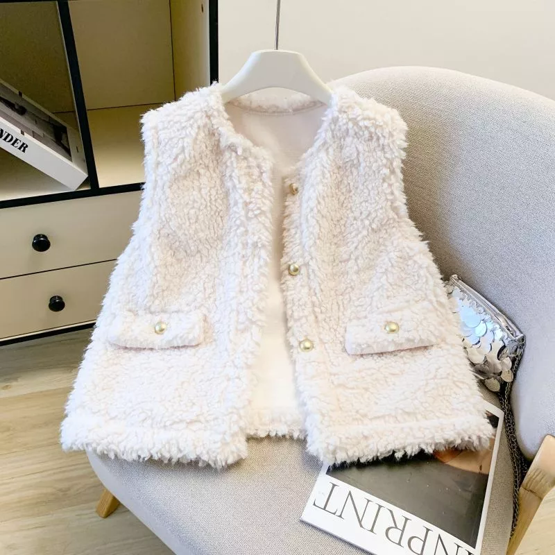Gilet Donna Bianco Beige Smanicato Effetto Peluche Con Bottoni E Tasche CF64091