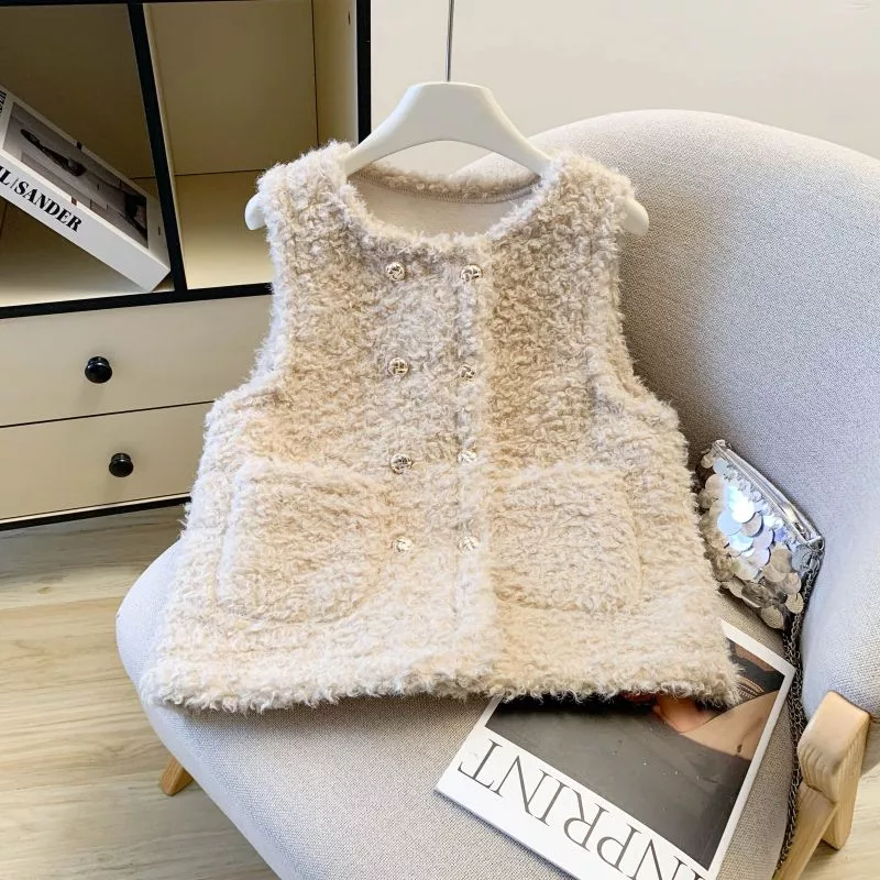Gilet Donna Bianco Panna Smanicato Effetto Peluche Con Bottoni E Tasche CF64091