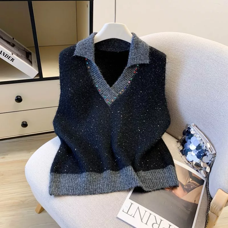 Gilet Donna Nero Smanicato In Maglia Morbida Con Scollo A V Decorato CF64089