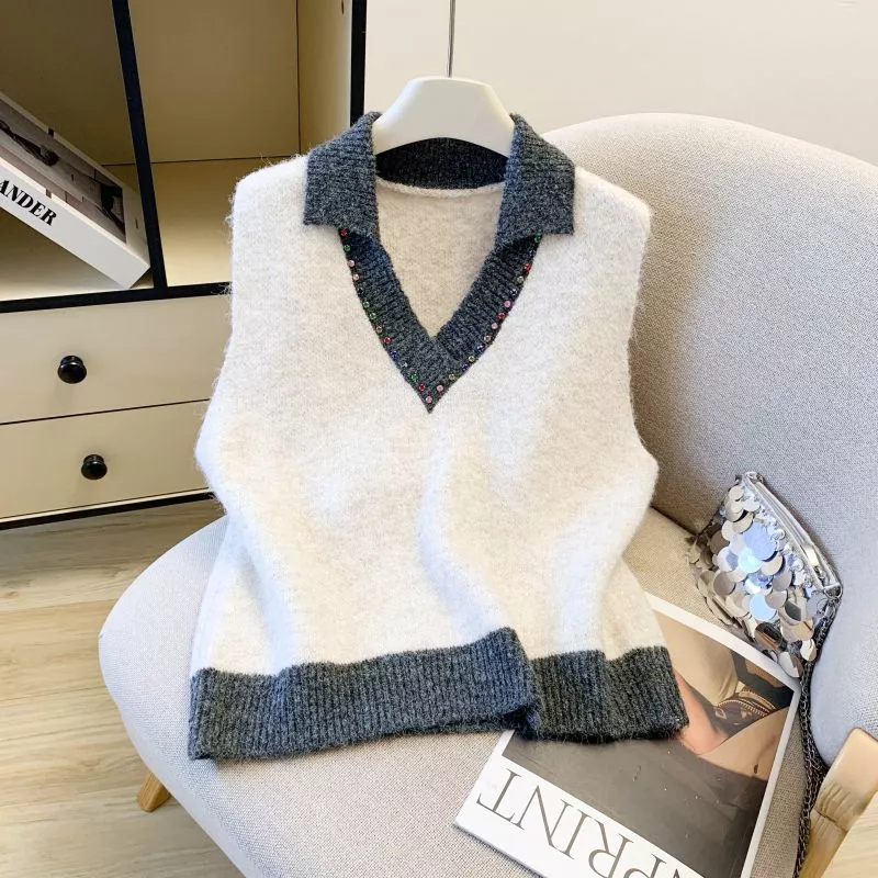 Gilet Donna Bianco Panna Smanicato In Maglia Morbida Con Bordi Contrasto CF64089