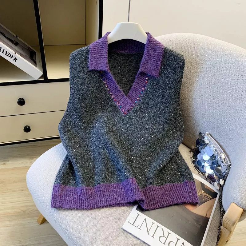 Gilet Donna Grigio Con Bordi Viola Smanicato In Maglia Morbida Elegante CF64089