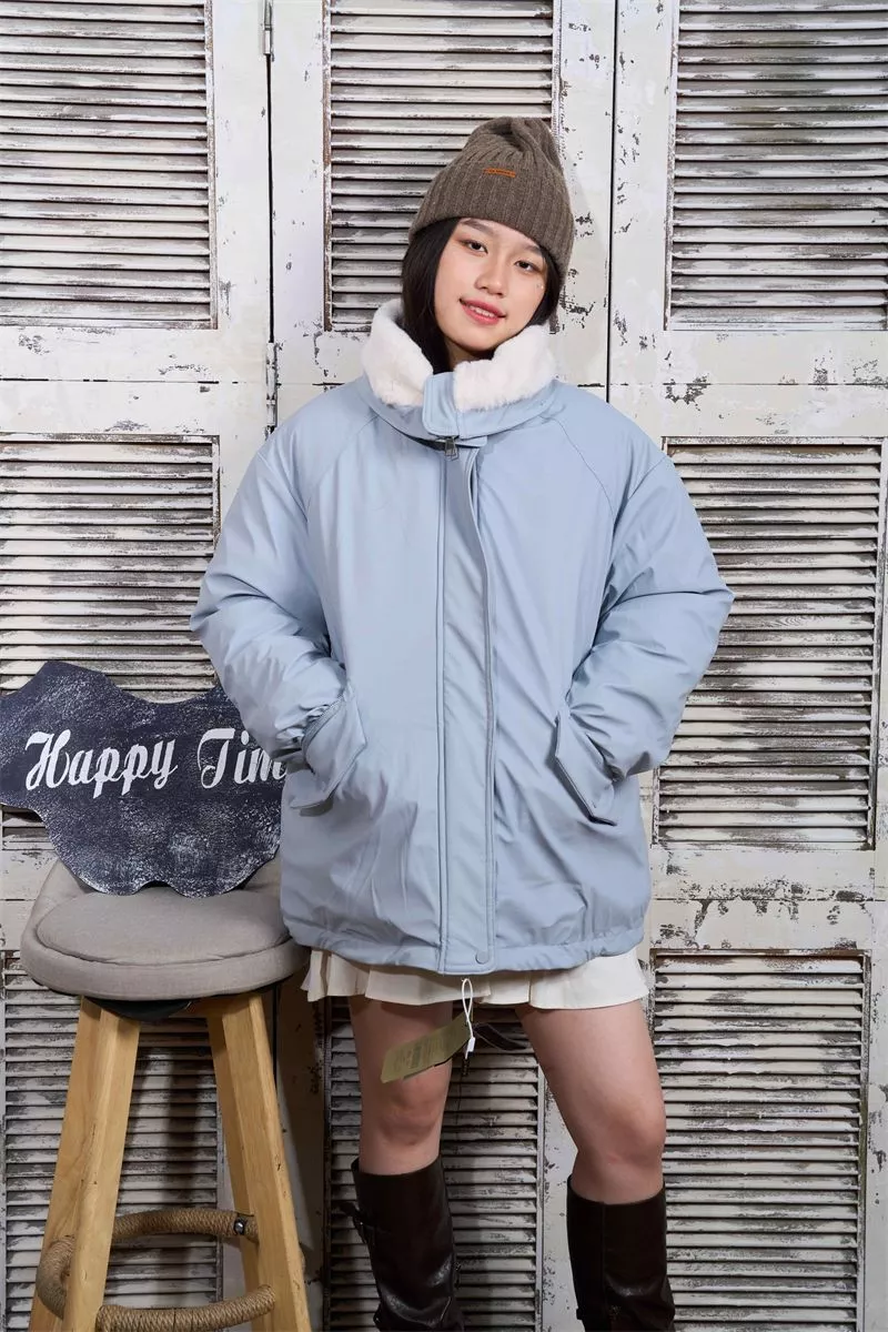 Giubbotto Azzurro Trapuntato Con Collo Pelliccia Morbida Elegante CF57092