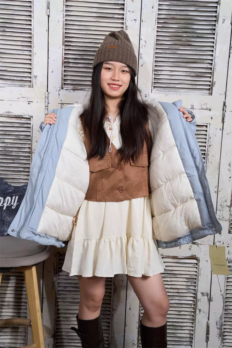 Un capo dal fascino moderno e raffinato: questo giubbotto corto imbottito con collo in pelliccia morbida unisce calore e femminilità in un design pratico e chic.