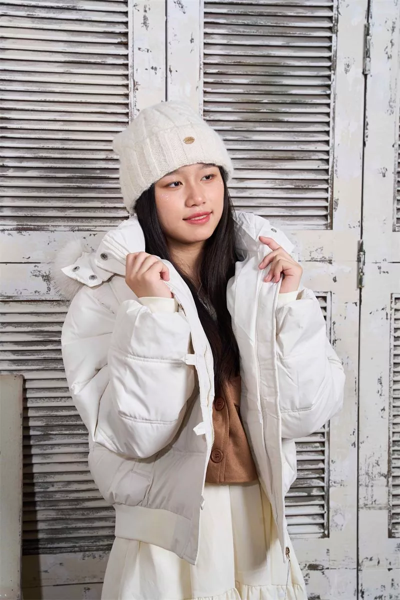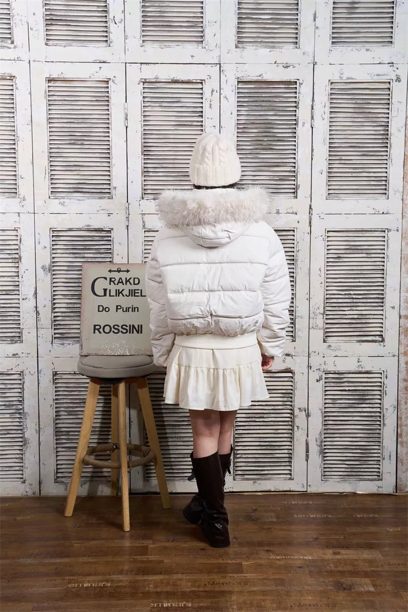 Giubbotto corto imbottito con cappuccio bordato in morbida eco pelliccia, perfetto per affrontare il freddo con stile.