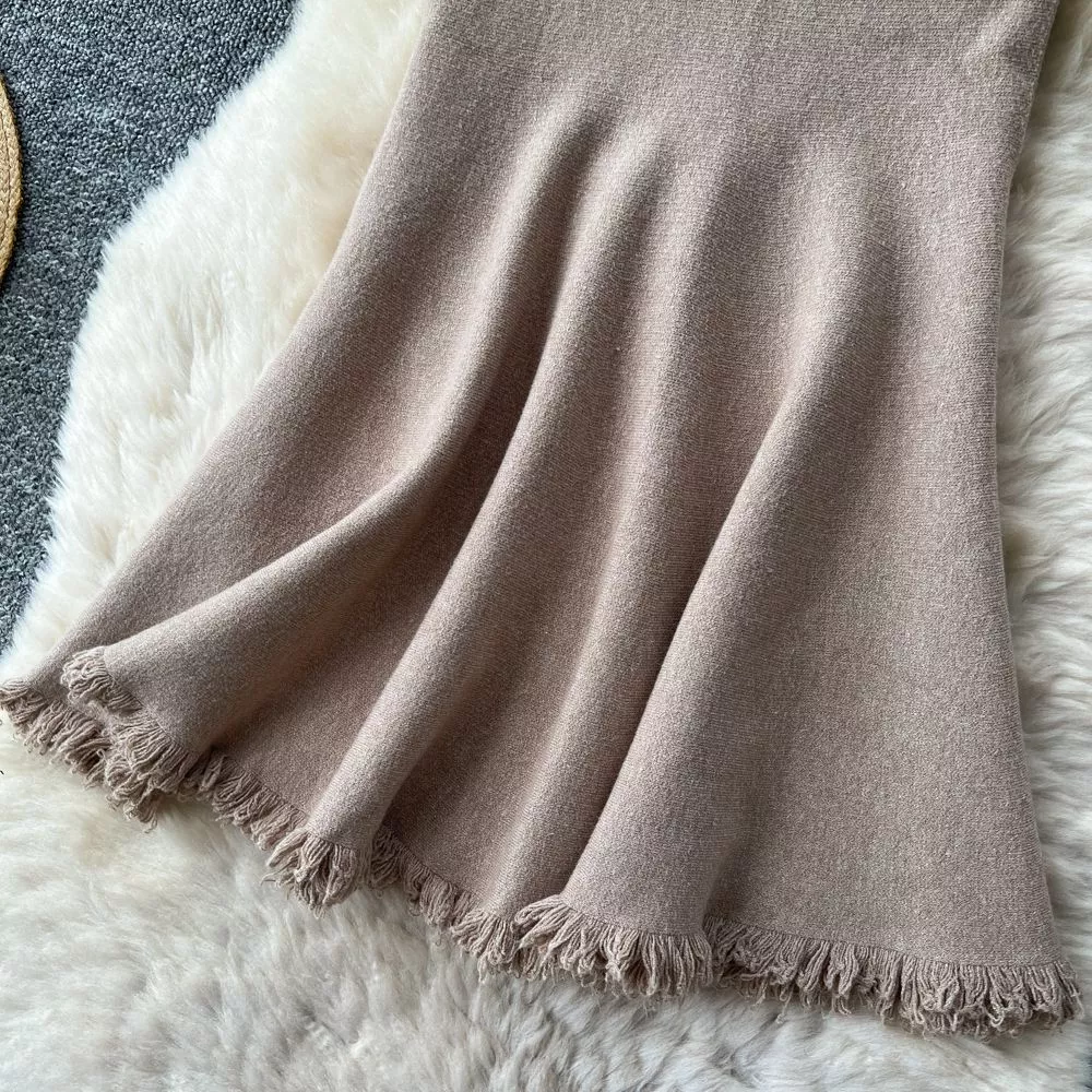 Gonna A Sirena Vita Alta Cammello Elegante Con Frange Stile Donna CF60307
