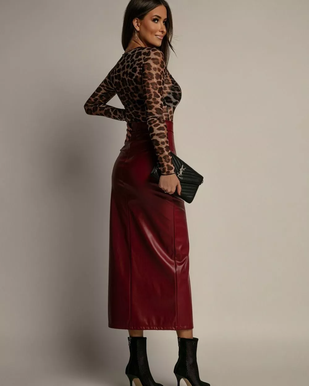 Gonna longuette effetto pelle dal design femminile e sofisticato, perfetta per look eleganti e outfit serali. Il taglio aderente valorizza la silhouette mentre lo spacco frontale dona movimento e sensualità al capo. Un modello versatile ideale per creare abbinamenti raffinati per ufficio, eventi e serate.