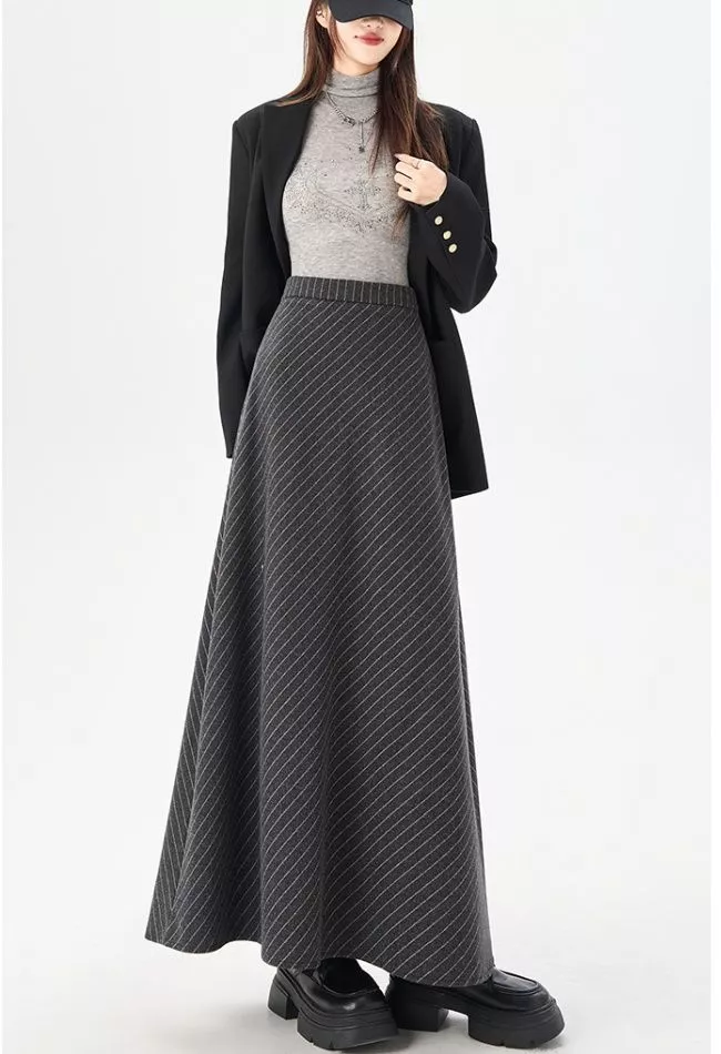 Gonna lunga a trapezio dal taglio morbido e femminile, realizzata in tessuto effetto lana sottile. Il design svasato accompagna delicatamente la silhouette, offrendo comfort e libertà di movimento. La vita elasticizzata garantisce una vestibilità perfetta, mentre le linee diagonali sottili donano slancio alla figura. Perfetta per creare look casual eleganti, ideale per l’ufficio o per il tempo libero con un maglione oversize o una giacca sartoriale.