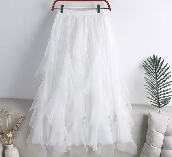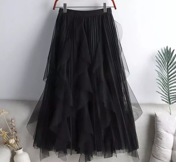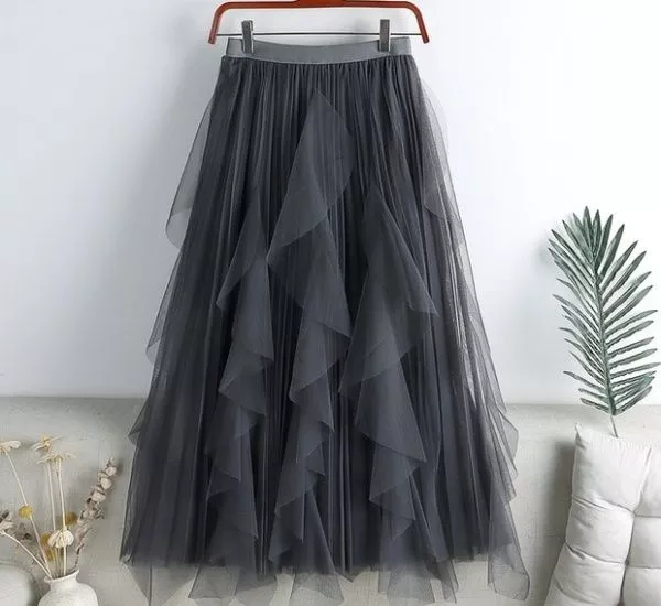 Gonna lunga in tulle con volant irregolari che creano un movimento morbido e scenografico. La vita alta elasticizzata valorizza la silhouette, mentre la lavorazione multistrato dona leggerezza e un aspetto elegante. Perfetta per outfit romantici, serate speciali, shooting fotografici o look sofisticati dal fascino moderno.