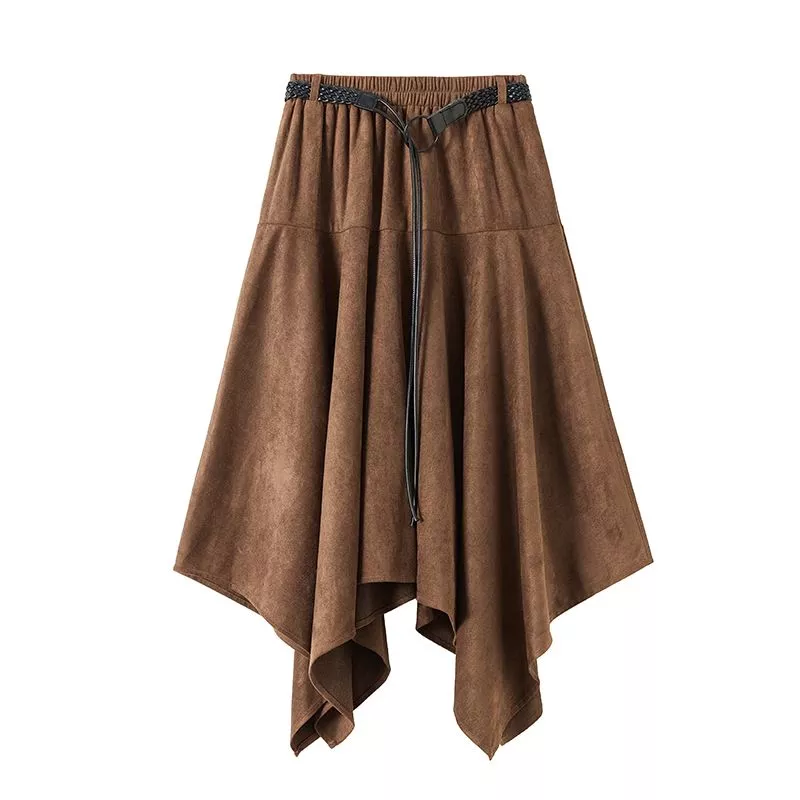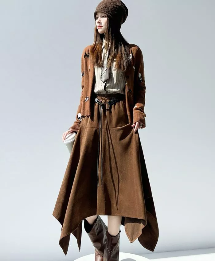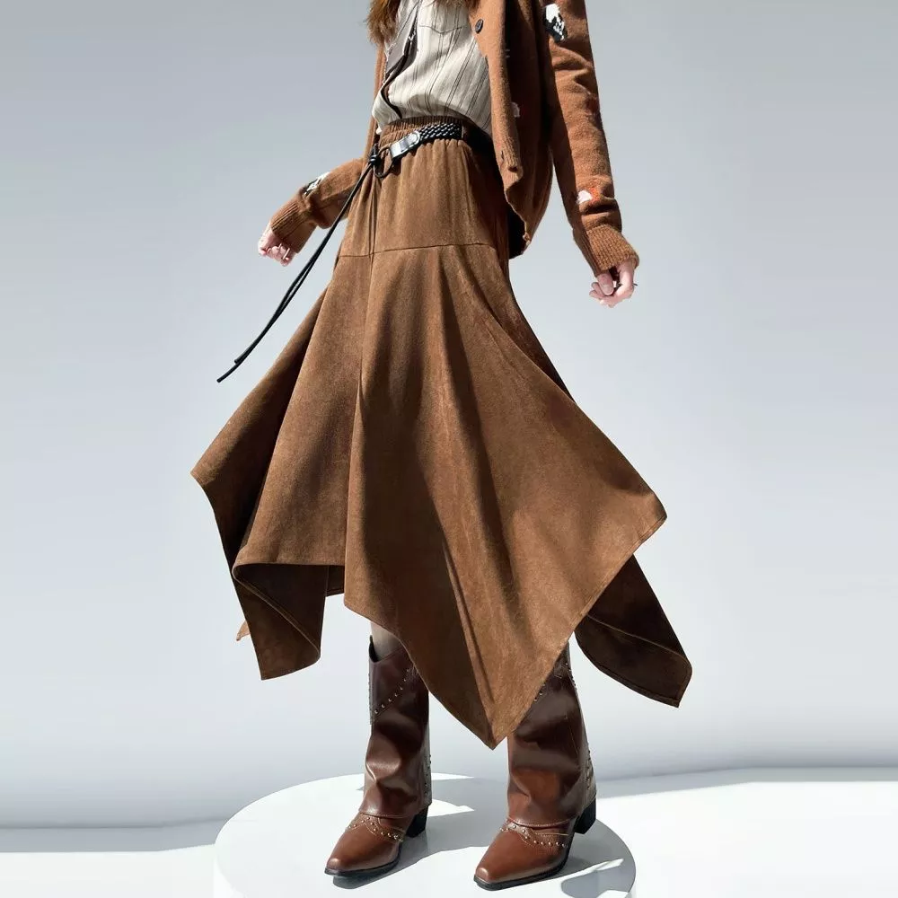 Gonna lunga asimmetrica realizzata in morbido tessuto sintetico effetto pelle scamosciata, dal taglio fluido e moderno.