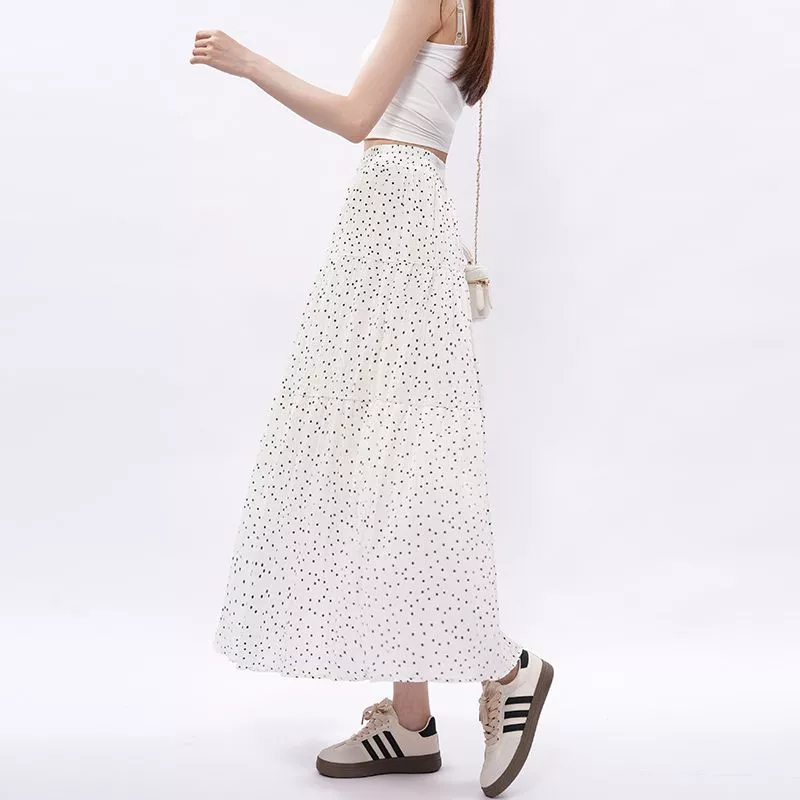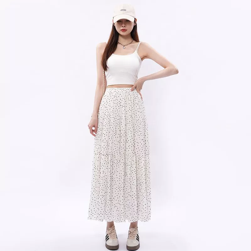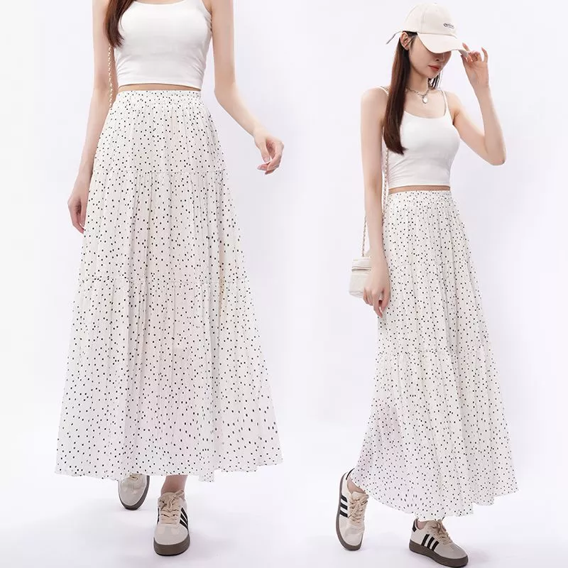 Gonna lunga e leggera con micro pois, disponibile in due eleganti varianti: fondo nero con pois bianchi e fondo bianco con pois neri. Il design con vita alta elasticizzata e taglio a balze dona una linea fluida e femminile. Ideale per look primaverili ed estivi, da giorno o da sera, è perfetta con top, sneakers o sandali. Realizzata in tessuto sintetico leggero, assicura freschezza e stile.