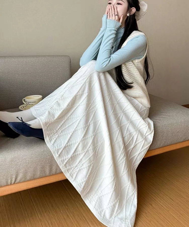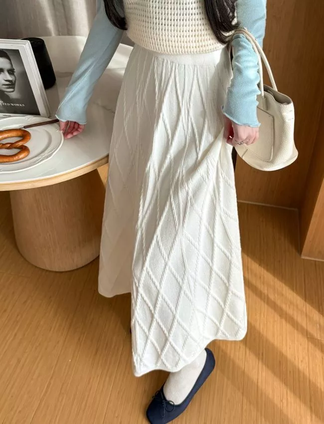 Gonna lunga donna dal design essenziale e raffinato, caratterizzata da una silhouette a linea A che accompagna il movimento con naturalezza. Il tessuto presenta una lavorazione testurizzata a motivo geometrico irregolare, che dona profondità visiva al capo mantenendo uno stile pulito ed elegante. La vita è elasticizzata e ben definita, pensata per garantire comfort e vestibilità adattabile. Un modello versatile, ideale per look quotidiani curati, perfetto da abbinare a maglieria morbida, top aderenti o camicie per outfit equilibrati e femminili.