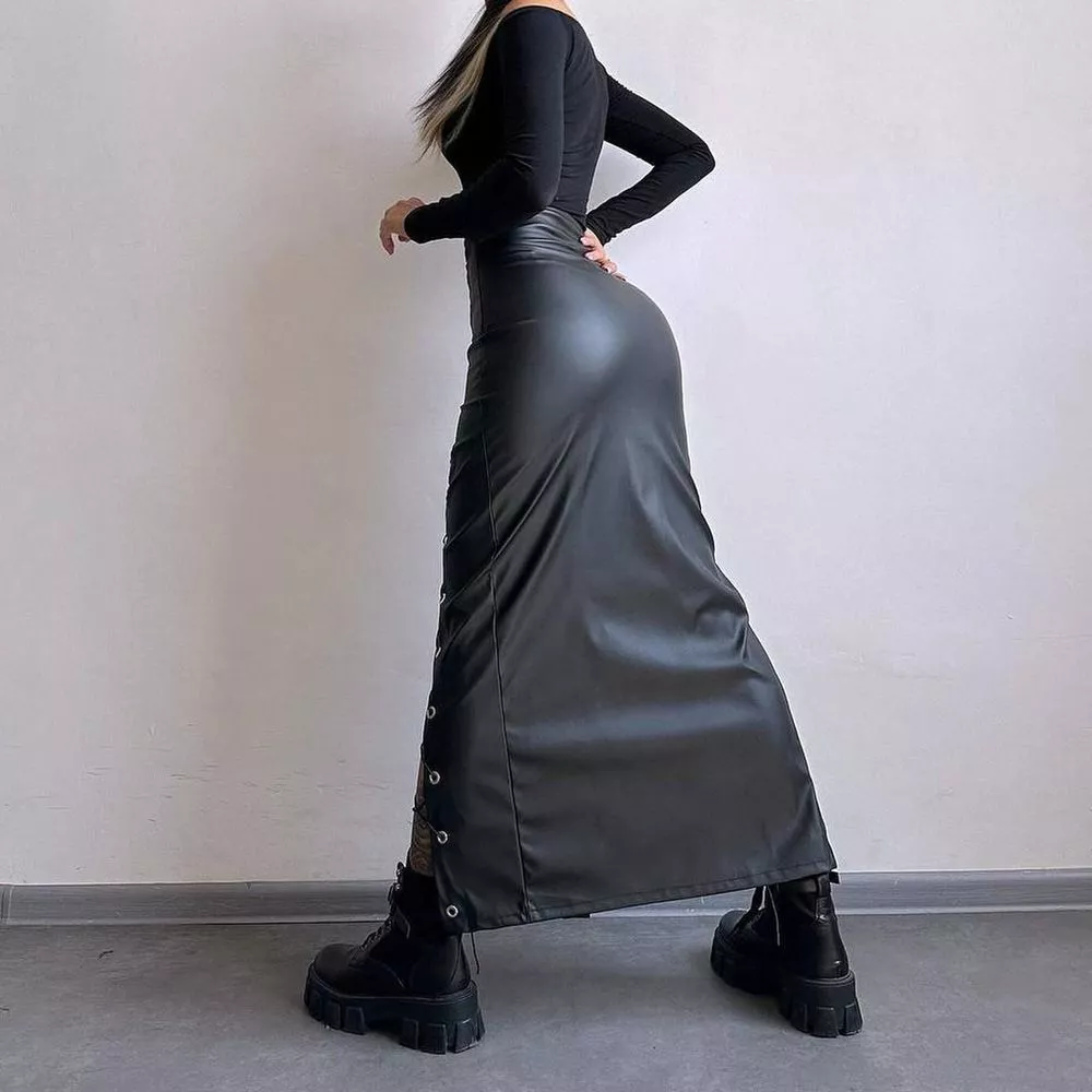 Gonna lunga effetto pelle dal design audace e contemporaneo, perfetta per outfit serali, party e look festival. Il modello aderente valorizza la silhouette mentre i lacci laterali regolabili con maxi spacchi creano un effetto grintoso e seducente. Un capo statement ideale per creare look decisi e di forte personalità.