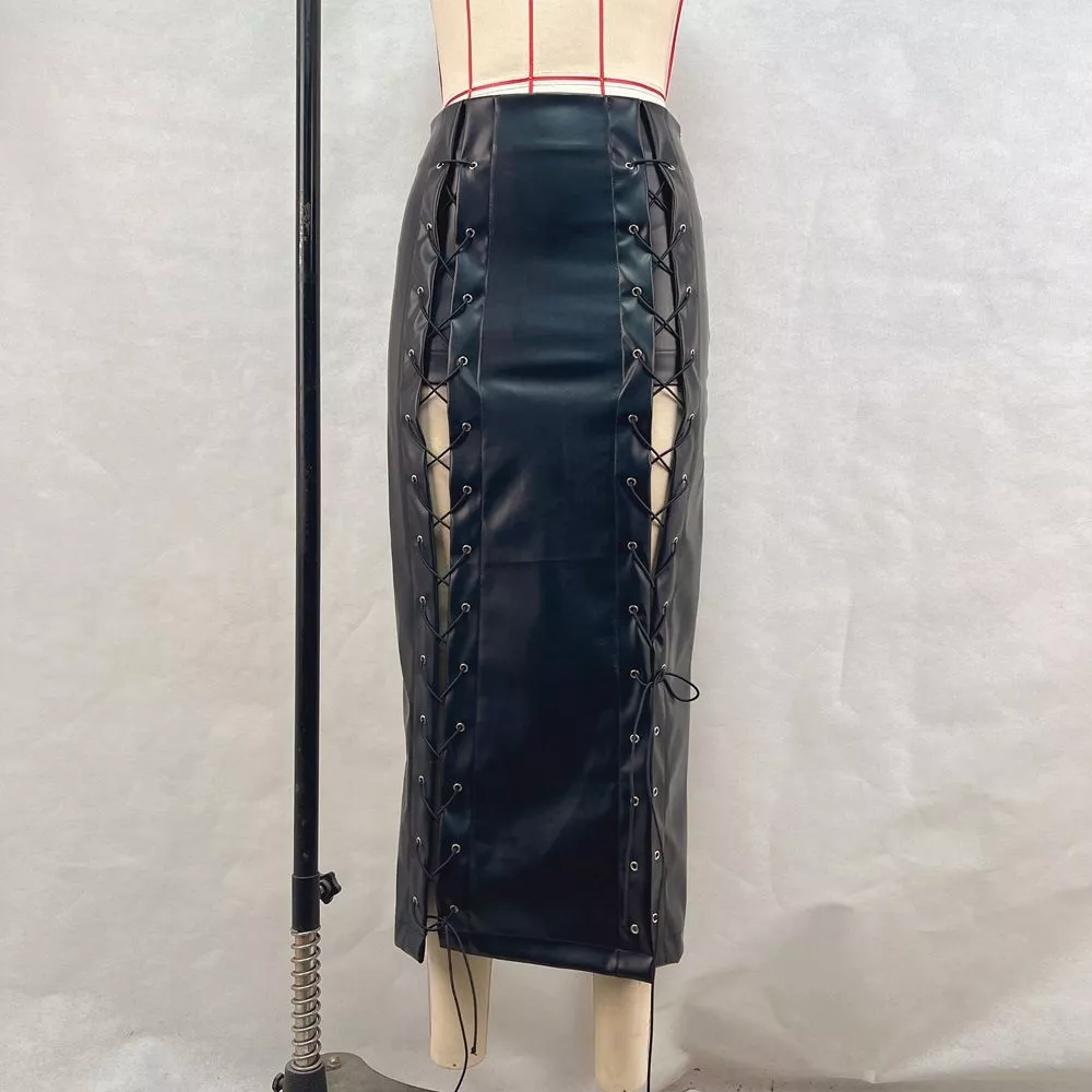 Gonna Lunga Effetto Pelle Con Lacci Laterali Spacco Nero Sexy CF67651
